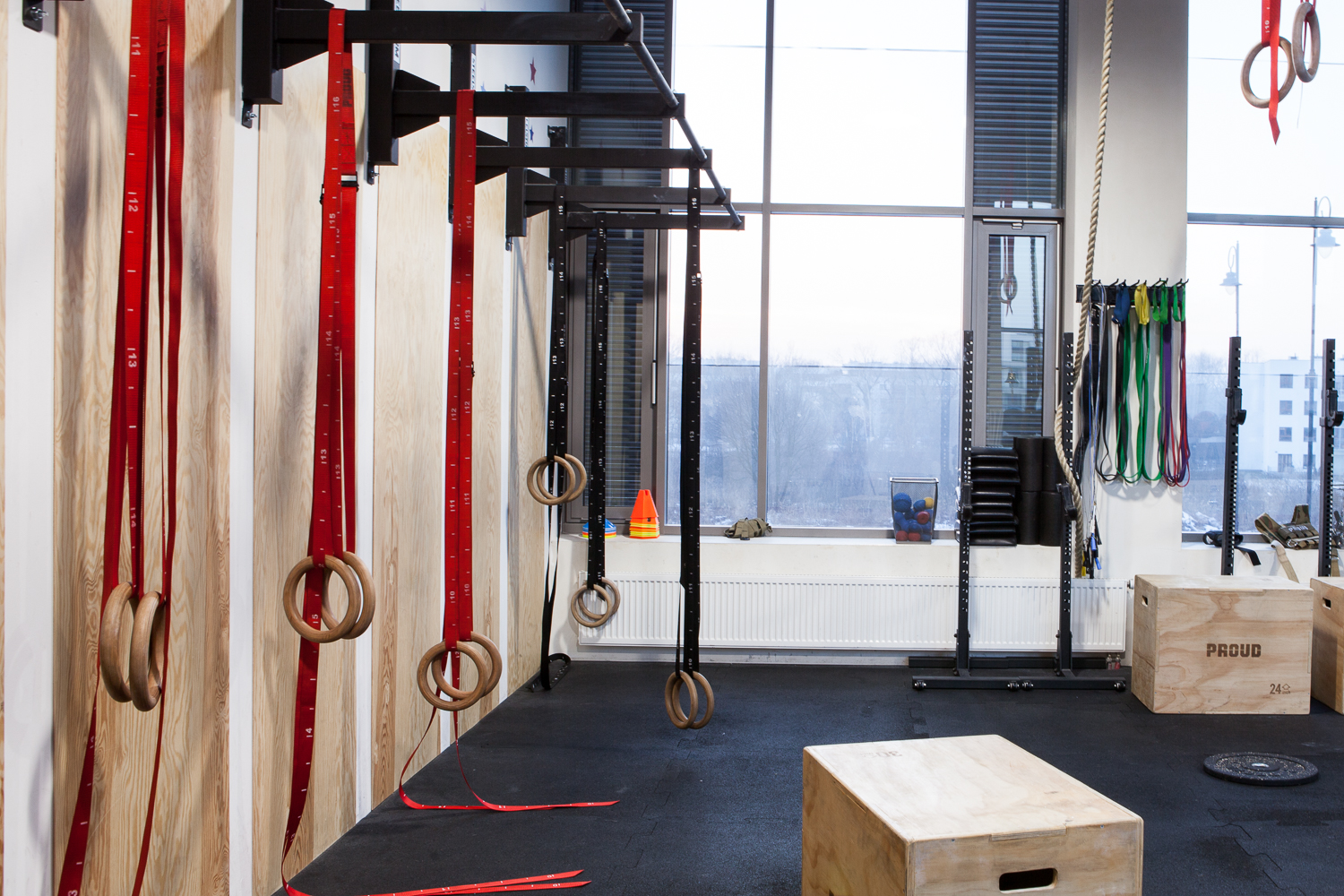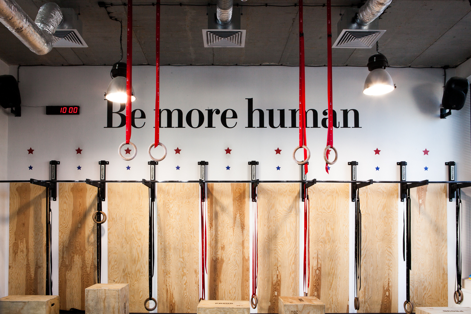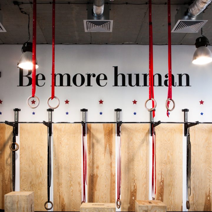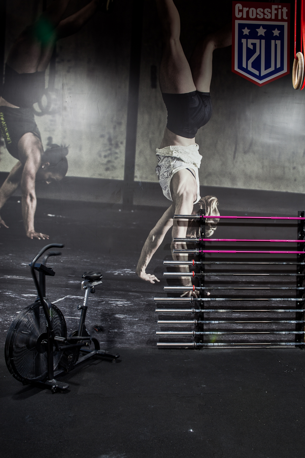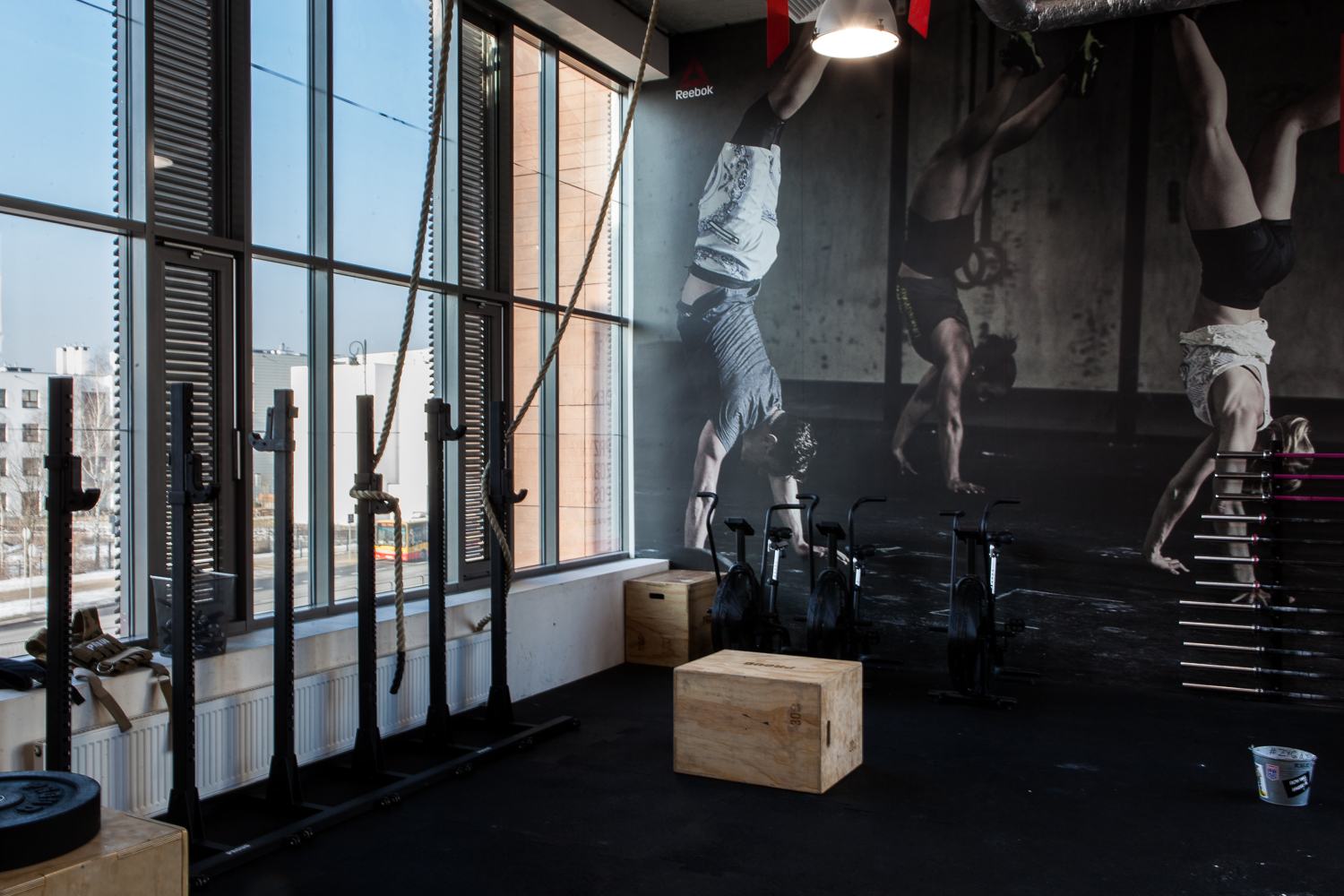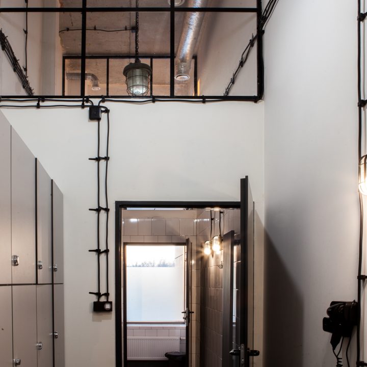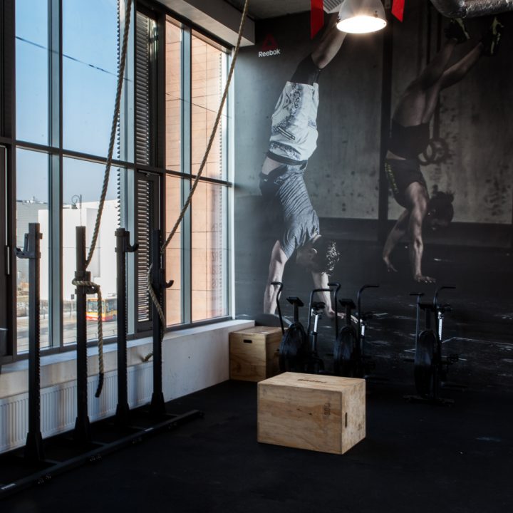 Projekt wnętrza powstał na potrzeby ludzi, których połączyła sportowa pasja do Crossfitu. głównym celem było stworzenie podziału funkcjonalnego w wysokiej, otwartej przestrzeni, z wyraźnie zaznaczonym podziałem na część socjalną z szatniami oraz salę do ćwiczeń przy zachowaniu loftowego charakteru. Aby doświetlić wąską, długą i wysoką przestrzeń szatni zdecydowałyśmy się na duże naświetla w czarnej, stalowej ramie. Na sali ćwiczeń ściany z obu stron to potężne szklenia, dzięki którym nie brakuje światła dziennego w tej strefie. Dwie pozostałe ściany są miejscem na sprzęt do ćwiczeń oraz recepcję. W lokalu przeważają jasne kolory, jedynym ciemnym akcentem jest fototapeta z motywem firmowym. 12u1 to mekka świata Crossfitowego na Wilanowie.
